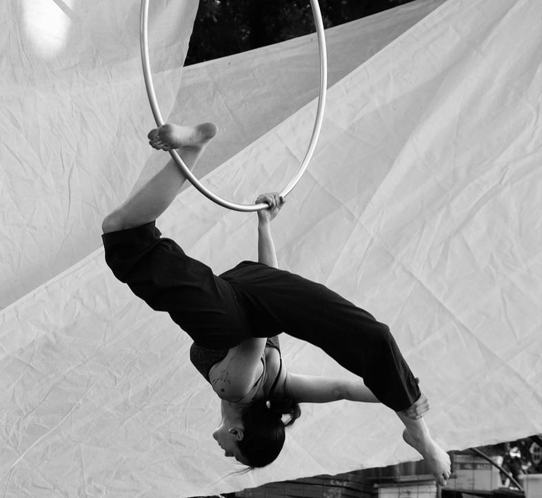 Depuis mes débuts en cerceau, j’ai toujours préféré le dynamique. Je pense que je me suis beaucoup inspirée des barres asymétriques en gym qui m’ont toujours impressionnées. J’ai également pratiqué la contorsion au cours de ma formation, ce qui me permet de mélanger dans mon travail le relâchement et l’explosivité.